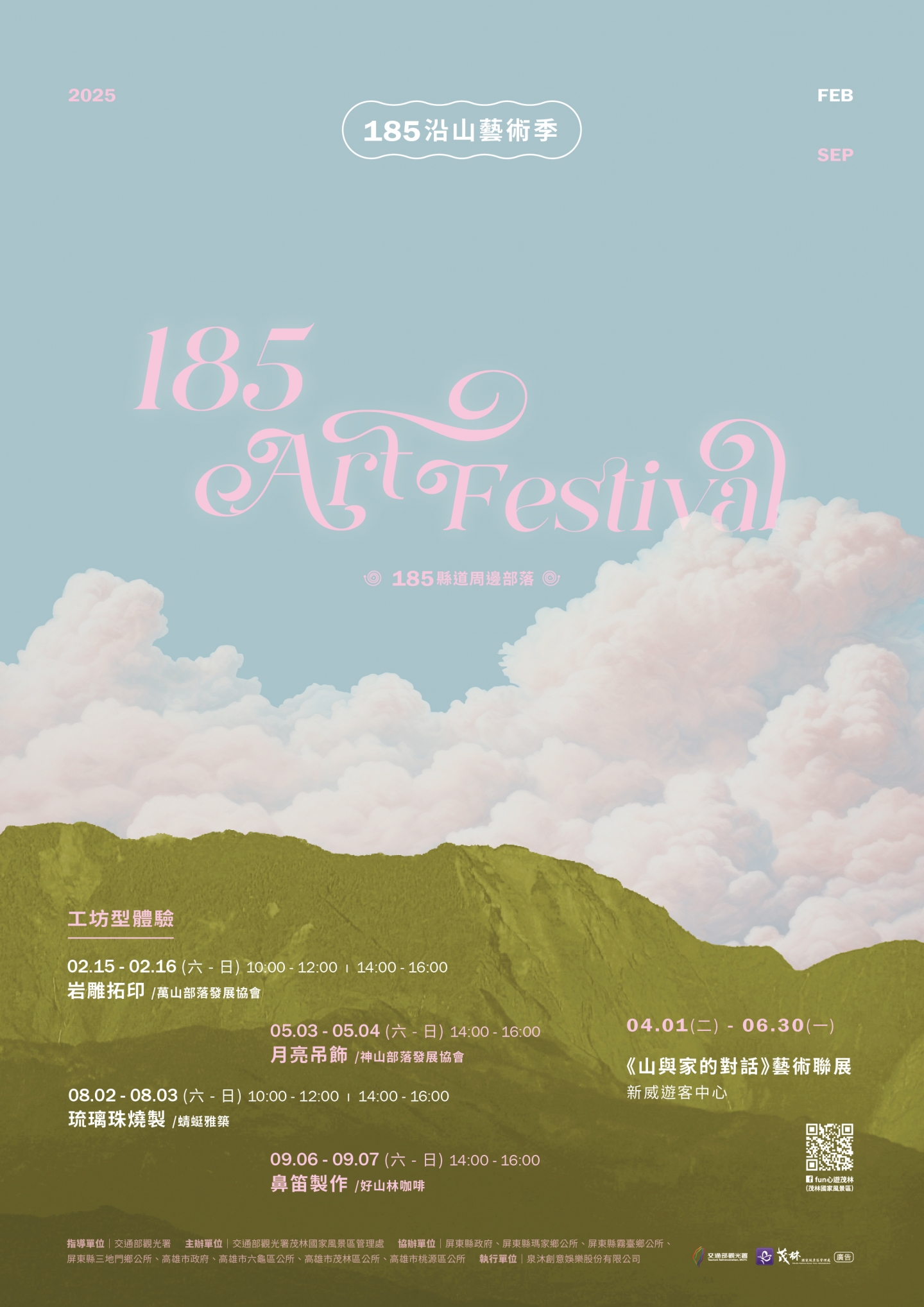「185沿山藝術季」是一場融合自然、人文與創意的藝術盛會,於台灣南部185縣道沿線各鄉鎮展開。活動邀請在地藝術家、工藝師與文化團體,透過展演、裝置藝術與工坊活動,與民眾共創一場深入社區的藝術饗宴。為推廣185沿線職人藝術體驗遊程,結合在地部落藝術家及當地職人一起帶動體驗教學、部落導覽,規劃一日原藝之旅,帶領大家認識原藝文化。